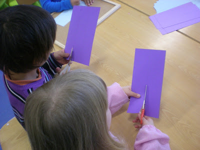 De seguida, a educadoras apresentaram umas folhas de papel com sete cores diferentes para uns alunos picotarem e outros recortarem. Com esses pedaços de papel, as educadoras criaram um arco-íris na parede.